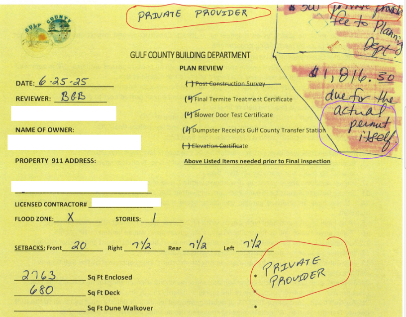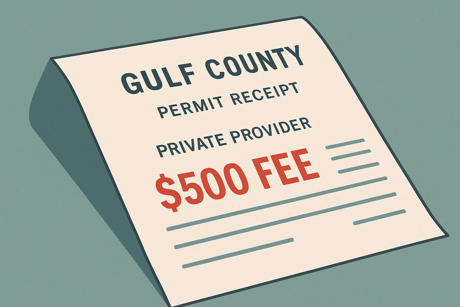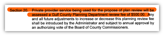 Gulf County is so comfortable with this clear flouting of state law that they wrote it into county code: “Private provider service being used for the propose (sic) of plan review will be assessed a Gulf County Planning Department review fee of $500.00.” Same plans, same counter, same door — extra fee and detour only if you use the private provider fast lane. That’s unequal treatment by design.