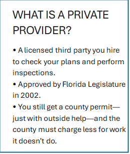 Every extra step slows a roof, a pool, an addition. After storms, days turn into weeks. Costs go up. Families wait. The Legislature created private providers to speed things along and mandated a fee reduction when private providers are used. Gulf County’s rule does the opposite and tells people they will be punished for using the tool the state gave them.