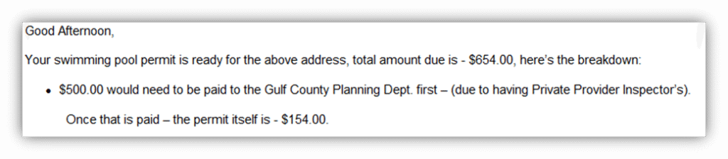In Bay County, a $250 “planning compliance review fee” is added to ALL permits (another RTF story for another time) and the pool permit itself is $106 for a total of $356, still contrary to the state mandate, but lower than nearby – and much smaller – Gulf County.