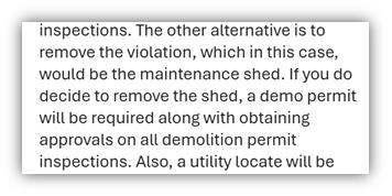 • And trimming part of a wall because the corner of the shed allegedly sat four inches over a property line, even after the neighbor submitted a letter saying they didn’t care.