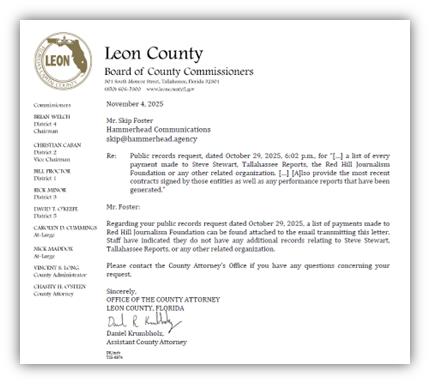 Meanwhile, the OEV weekly newsletter archive from this year, analyzed one by one by Red Tape Florida, shows an unbroken streak of zero real wins. Not a single new employer choosing Tallahassee. Not one. And yet city and county leadership remains remarkably quiet — as if failing to land a single project in 11 months is simply an unfortunate scheduling issue, not an indictment of the model.