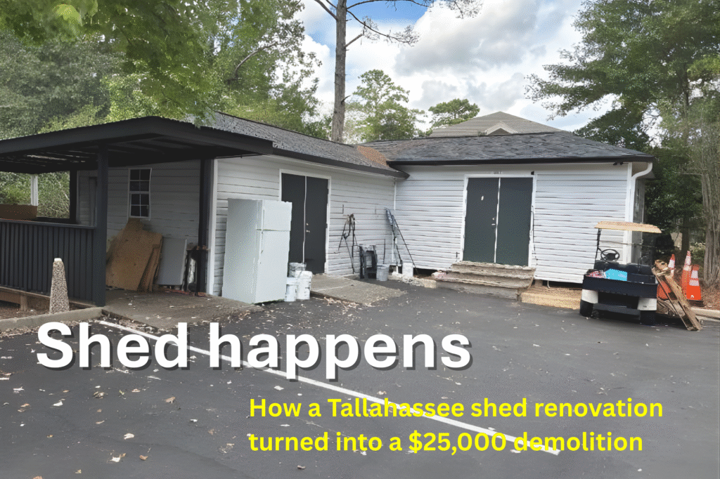 Yes, demolishing. A shed. From 1989. Not because it was dangerous. Not because it violated some modern fire-code breakthrough. But because the City of Tallahassee’s building bureaucracy turned a routine renovation into a three-year maze that would embarrass Kafka.
