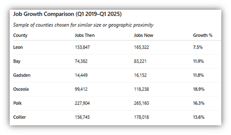 And make no mistake – this isn’t just missed opportunity – it translates to jobs … or, better put, a lack of them. Compared to similar-sized counties, or even small counties in close proximity to Leon, the county’s job growth since the start of 2019 has been anemic – just 7.5 percent growth in the past 6 years.