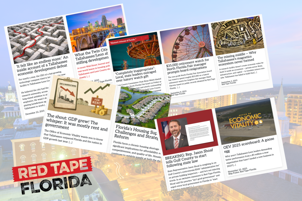 Red Tape Florida has become a consistent civic voice in Tallahassee and beyond. In Ormond Beach, Temple Terrace, Siesta Key, Gulf County, and dozens of other communities, we’ve dissected questionable economic development deals, challenged inefficient fee structures, published records that would have stayed buried, and aired reform ideas that struggle to find oxygen elsewhere.