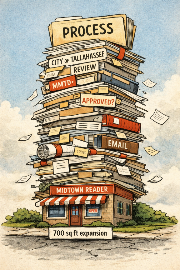 The Midtown Reader expansion debacle is not just a series about one business. It is a case study in how Tallahassee’s development process actually operates — and why so many in the private sector quietly say it doesn’t.